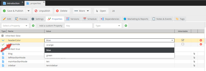 On this page we use "Properties" to hide the navigation on the left and to change the color of the header to blue.